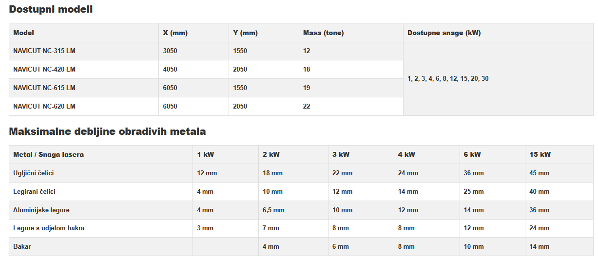 | Metal / Snaga lasera | 1 kW | 2 kW | 3 kW | 4 kW | 6 kW | 15 kW |