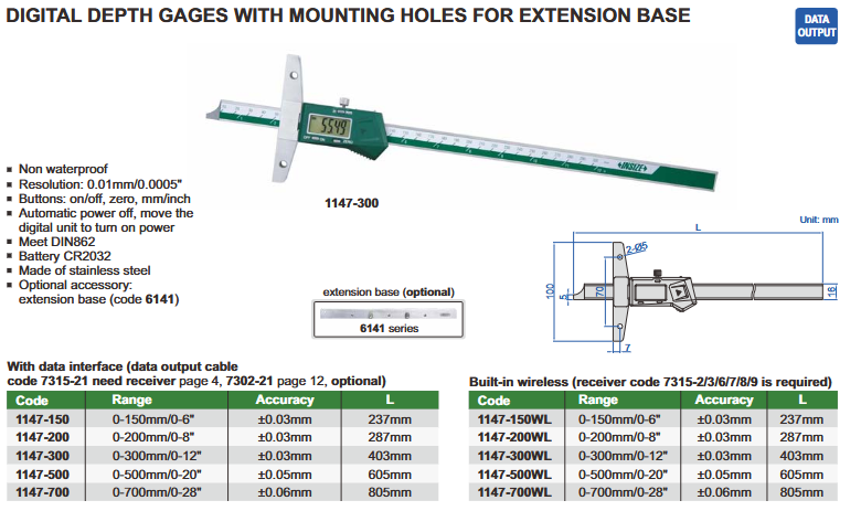 Dubinomjer - digitalni, s rupama za učvršćenje, 0-300 mm