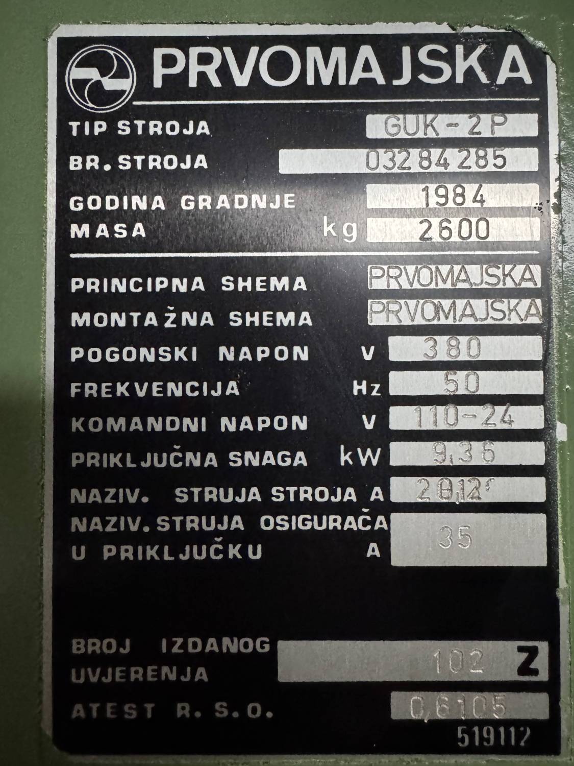 Model GUK-2P konstrukcijski odgovara glodalici GUK-2, s manjim razlikama u električnoj instalaciji i motorima. Podaci označeni s “(kataloški)” preuzeti su iz izvora: Metal-Kovis, Exapro i Gindumac (tehničke baze za Prvomajska strojeve).