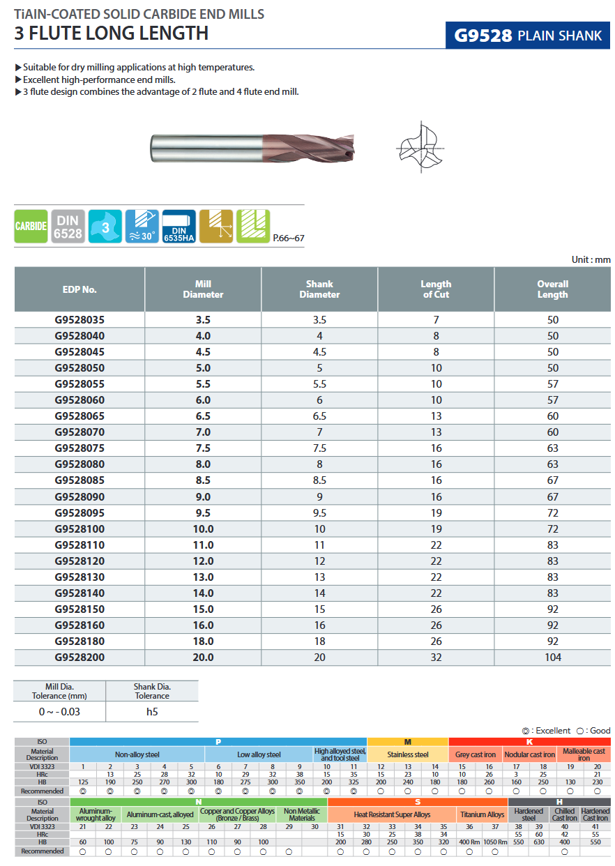 Glodalo TM Ø9,5 mm, 3P, DIN6528, TiAIN, YG-1