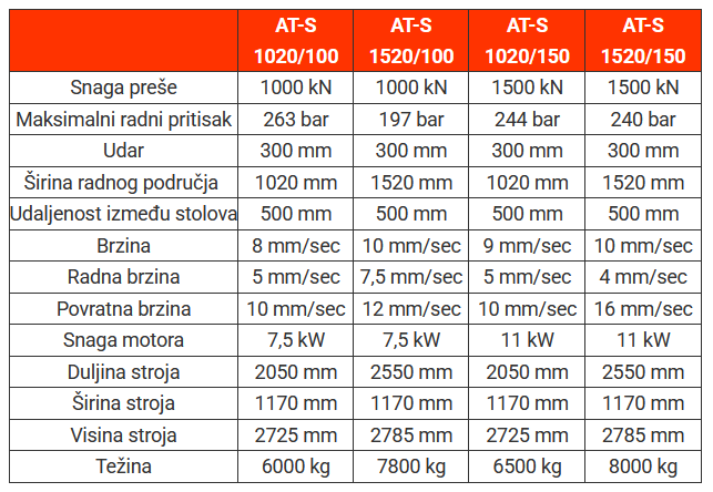 | Snaga preše | 1000 kN | 1000 kN | 1500 kN | 1500 kN |