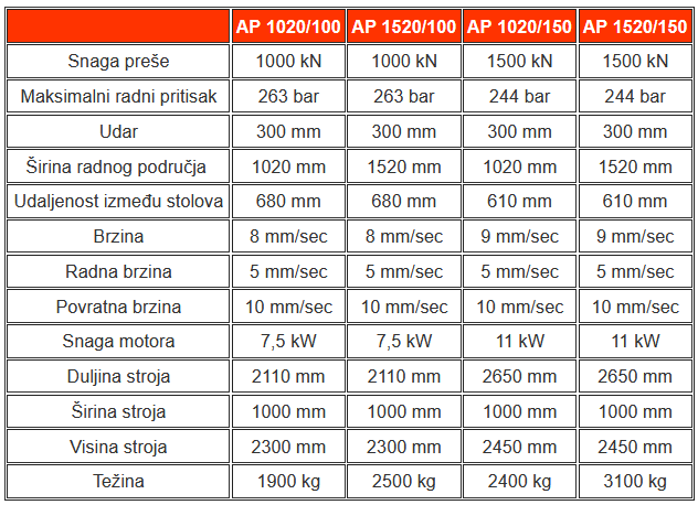 | Snaga preše | 1000 kN | 1000 kN | 1500 kN | 1500 kN |