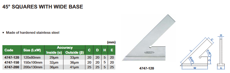 Kutnik 45° s bazom, 200×130 mm, Insize