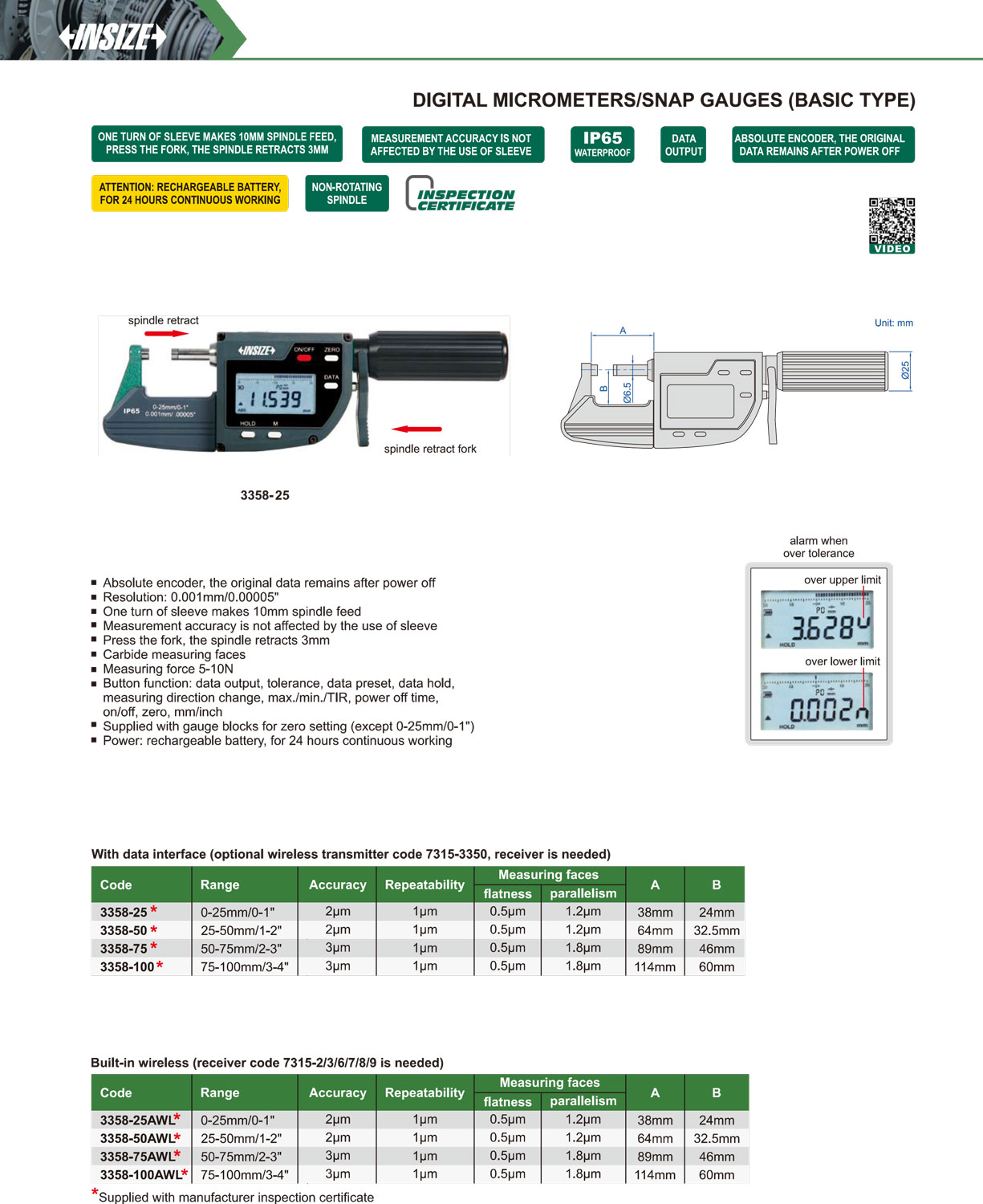 INSIZE 3358-25 – Digitalni mikrometar / Snap Gage (0–25 mm / 0–1″)