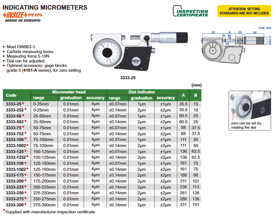 - Opcionalni dodatak: etalonski blokovi - razred 0 (serija 4101-A), za podešavanje nule