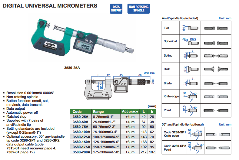 - funkcije: on/off, set, mm/inch, ABS/INC, data output