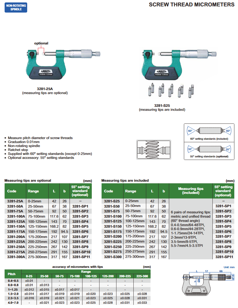 - Isporučuje se s 60° etalonima za podešavanje (osim modela 0–25 mm)