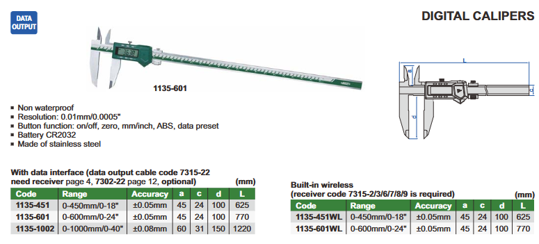 - funkcije: on/off, zero; mm/inch, ABS, data present