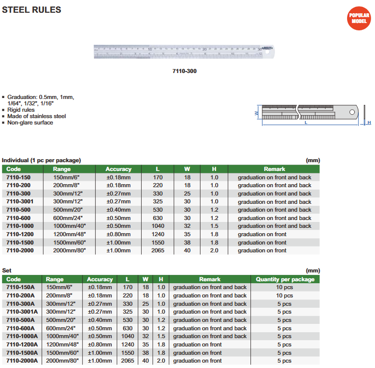 - Gradacija: 1/64", 1/32", 1/16, 0.5mm, 1mm.