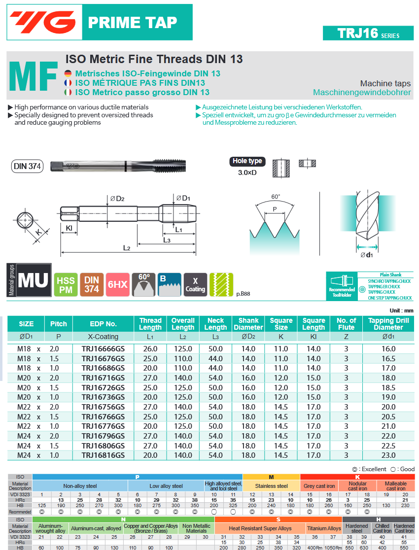 Ravni strojni ureznik, MF18x2 HSS-PM DIN374/B, YG-1