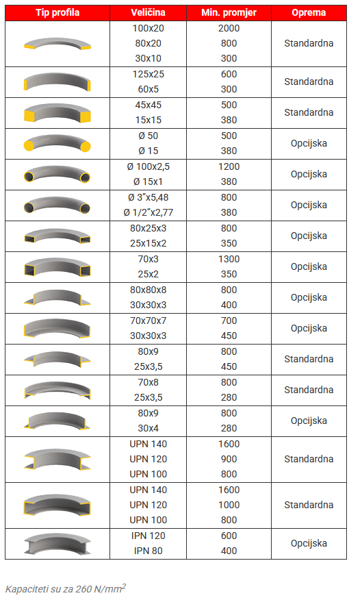 | Tip profila | Veličina | Min. promjer | Oprema |