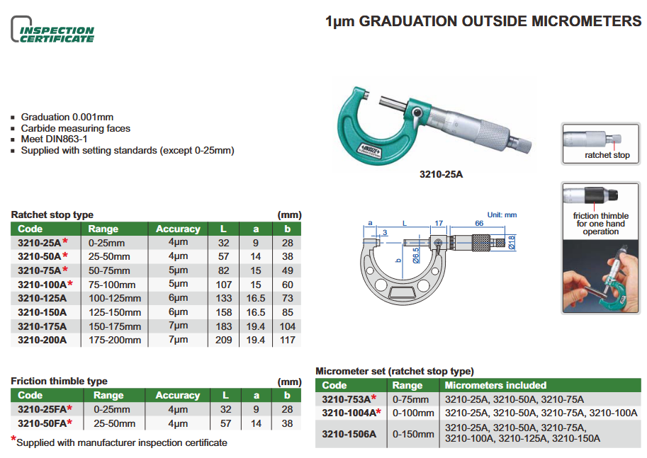 - dolazi s mikrometrima: 3210-25A, 3210-50A, 3210-75A, 3210-100A, 3210-125A, 3210-150A