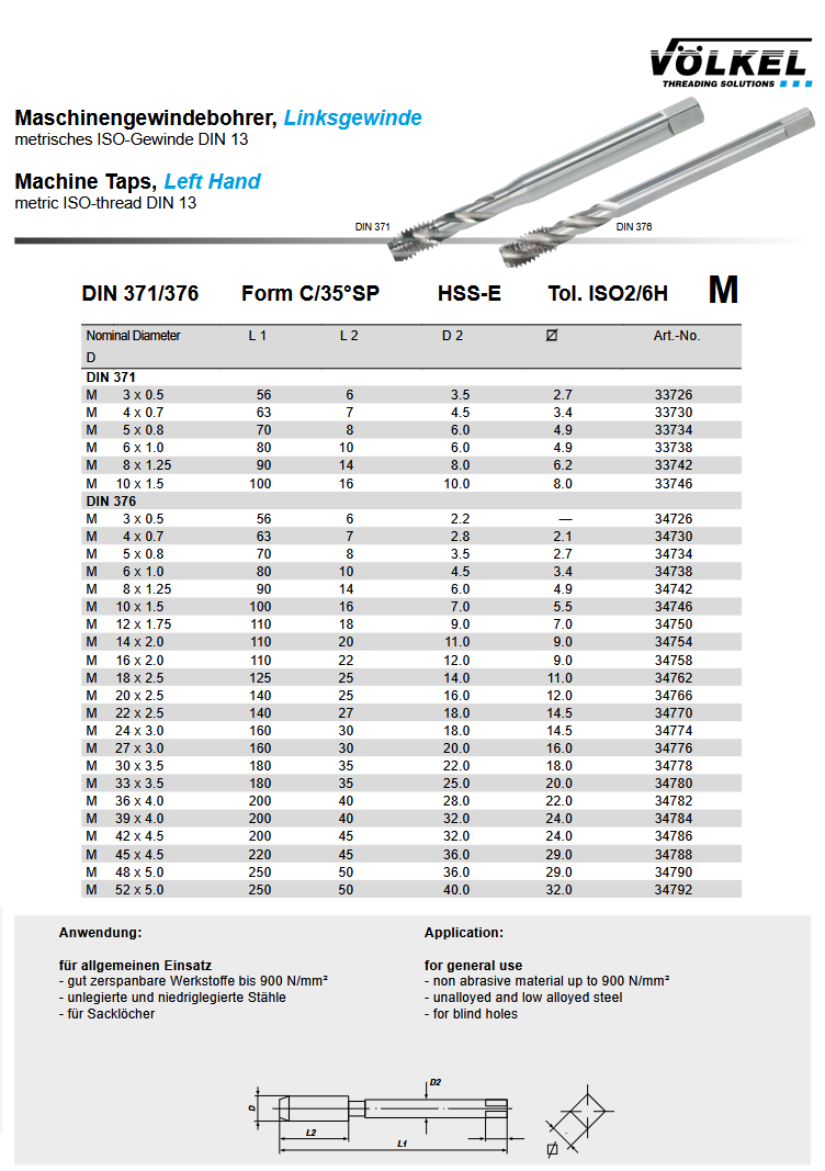 Spiralni strojni ureznik - lijevi, M10 HSS-E DIN 376/C, Völkel
