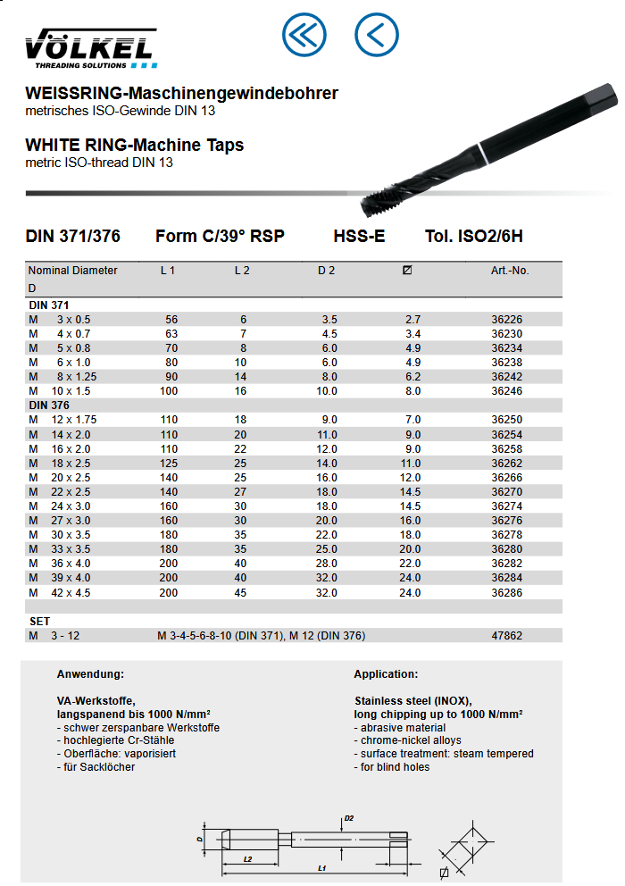 Spiralni strojni ureznik, M14 HSS-E DIN 376-C bijeli prsten, Völkel
