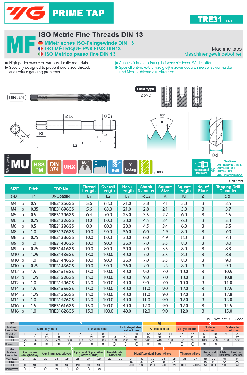 Spiralni strojni ureznik, MF6x0,5 HSS-PM DIN374/C, YG-1