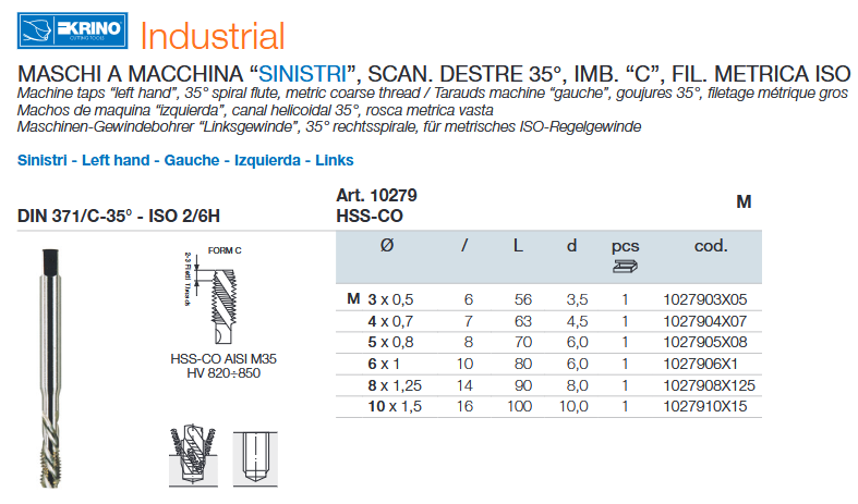 Strojni ureznik, lijevi, M6×1, HSS-Co, DIN371/C-35