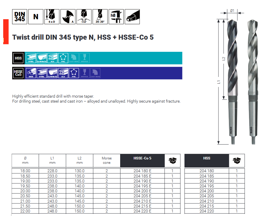 Svrdlo Ø20,5 mm, HSS DIN345 MK2