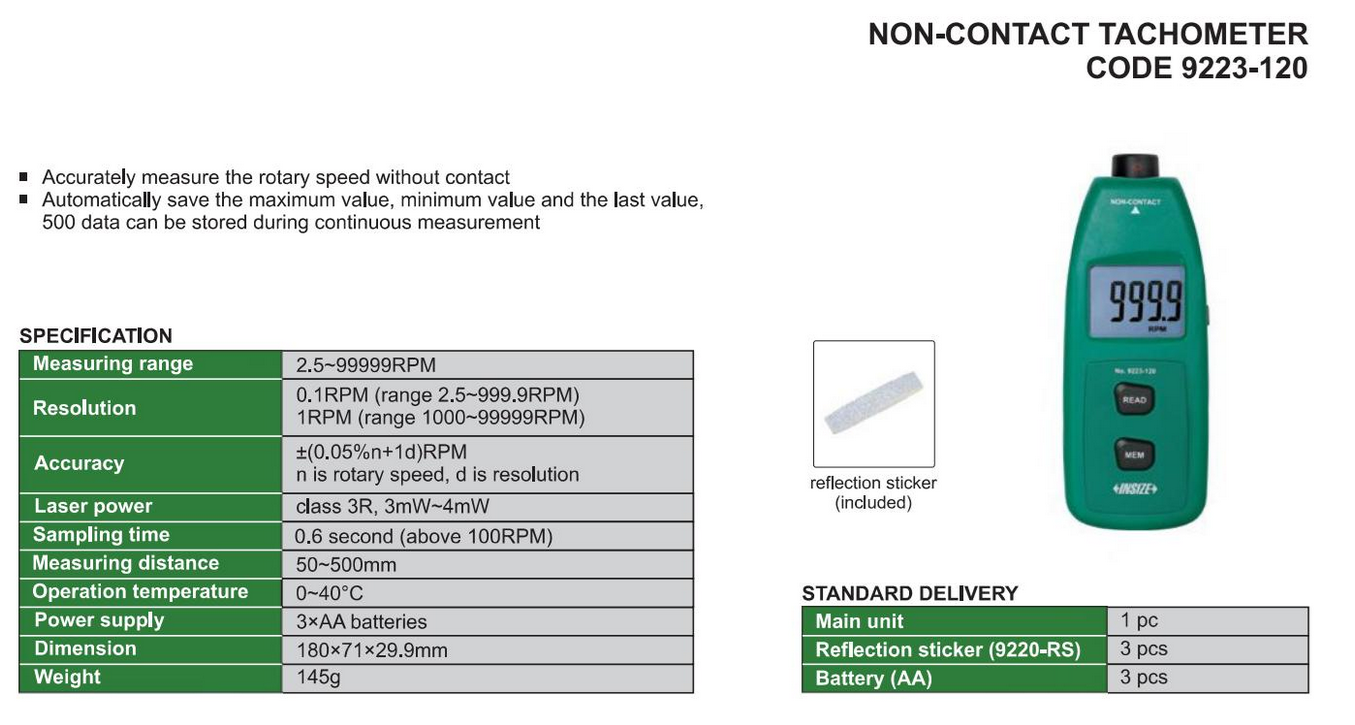 - Raspon mjerenja: 2,5-99999 o/min (RPM)