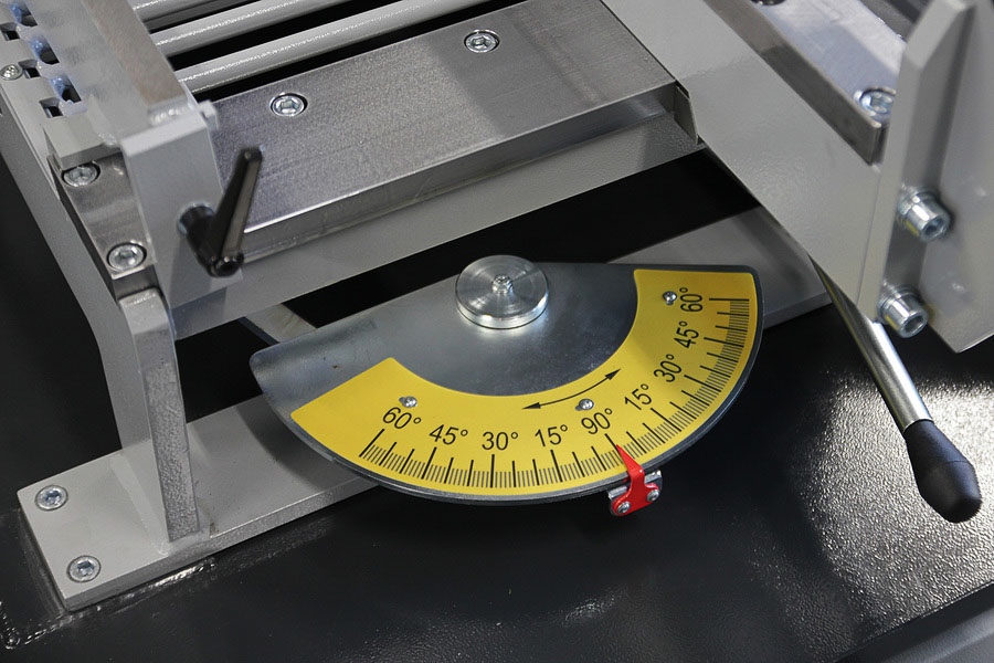 Ruka tračne pile pričvršćena je s obje strane na čvrsti zakretni stol pomoću konusnih valjkastih ležajeva s prednaprezanjem, što osigurava visoku krutost sustava. Zakretni stol rotira se zajedno s pilom, pa traka ne ulazi u površinu za polaganje materijala. Kut rezanja se podešava pomoću kutne ljestvice ili digitalno putem zaslona.