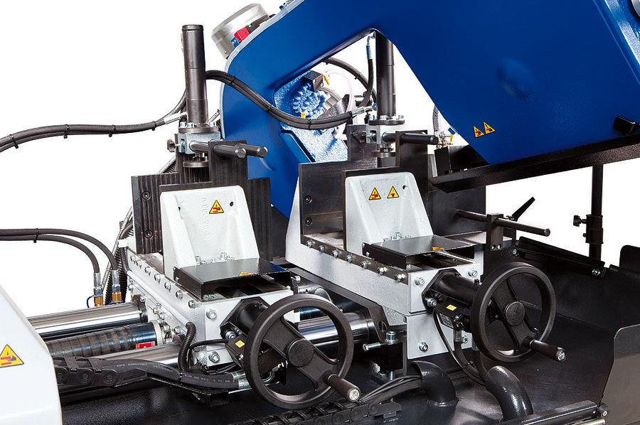 Hidraulički sustav upravlja stezanjem obratka i pomicanjem ruke u i iz reza. Plutajući dizajn škripca osigurava precizno stezanje i pomicanje čak i neravnih komada. Regulacija tlaka škripca standardno je uključena.