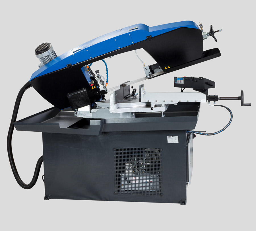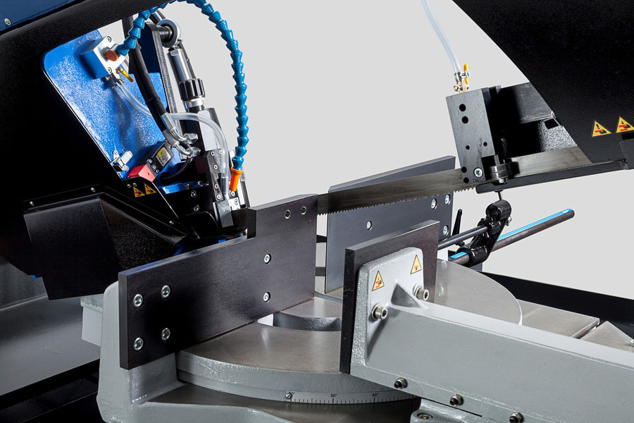 Kut rezanja podešava se jednostavno pomoću skale s graničnicima fiksiranim na 60° desno i 45° lijevo. Masivni škripac s brzim stezanjem omogućuje pouzdano fiksiranje materijala. Kotači velikog promjera i trostrano vođenje trake od tvrdog metala osiguravaju preciznost i trajnost. Sve električne instalacije i hlađenje integrirani su unutar kraka radi zaštite i lakšeg održavanja.