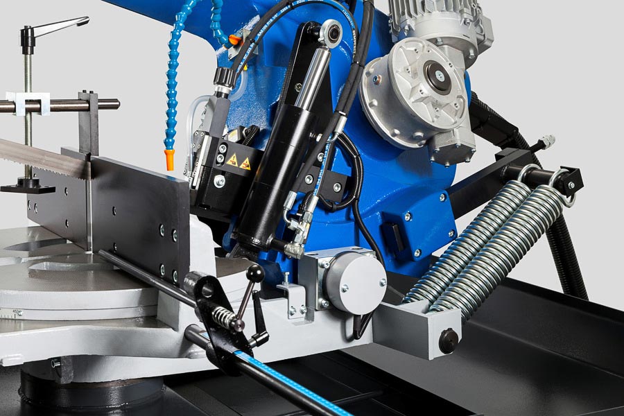 Stroj je opremljen snažnom industrijskom hidrauličkom jedinicom koja omogućuje podešavanje kontaktnog tlaka škripca. Hidraulički kontrolirano pomicanje trake pile u rez osigurava visoku učinkovitost, osobito kod serijskog rezanja i materijala visoke gustoće. Frekvencijski pretvarač omogućuje podešavanje optimalne brzine u rasponu od 15 do 90 m/min, čime se povećava preciznost i vijek trajanja trake.