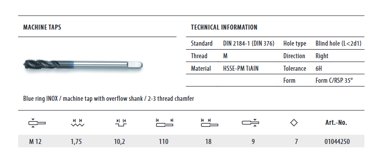 - Strojni ureznik, DIN 376, C/RSP35, HSSE-PM/TiAIN, M12