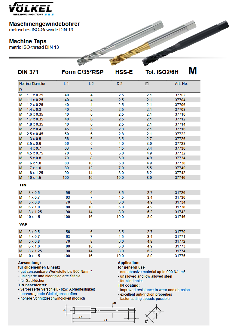 Spiralni strojni ureznik, M10 DIN 371 HSS-E, Völkel