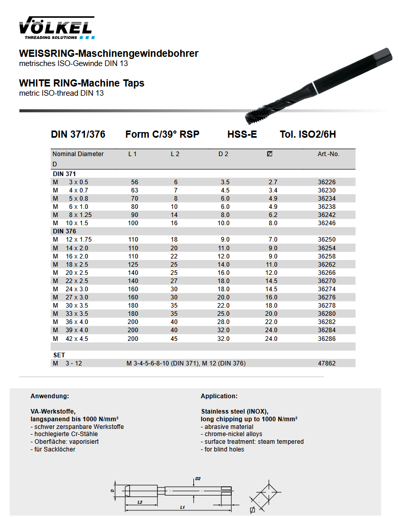 Spiralni strojni ureznik, M12 HSS-E DIN 376-C bijeli prsten, Völkel