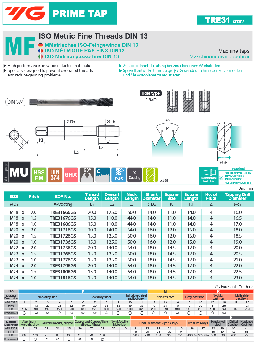 Spiralni strojni ureznik, MF24x2 HSS-PM DIN374/C, YG-1