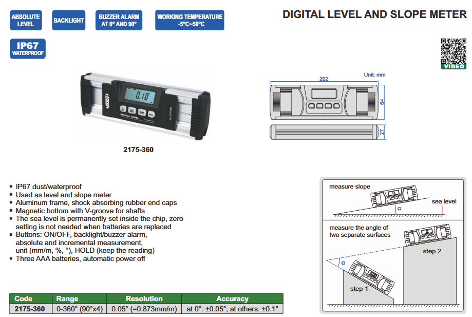 - Tipke: UKLJUČI/ISKLJUČI, pozadinsko osvjetljenje/piezo alarm, apsolutno i inkrementalno mjerenje, jedinice (mm/m, %, °), HOLD (zamrzavanje očitanja)