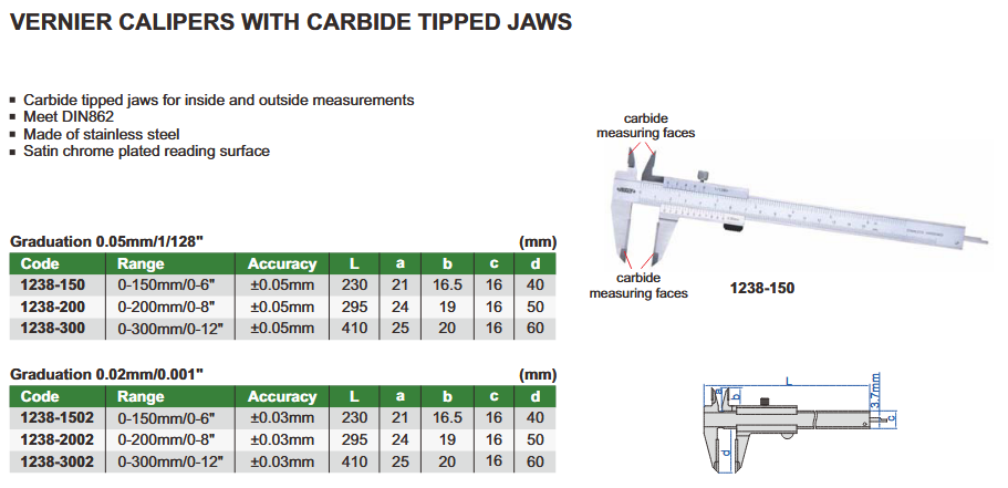 Vernier Caliper With Carbide Tipped Jaws 0-150mm 0.05mm