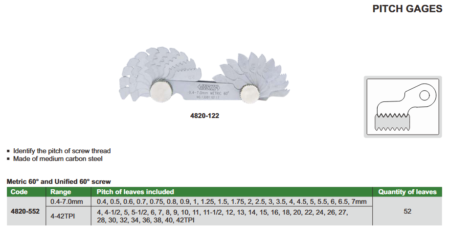 Pitch Gauge, Metric 60 And Unified 60 0.4-7.0mm, 4-42TPI 52pcs
