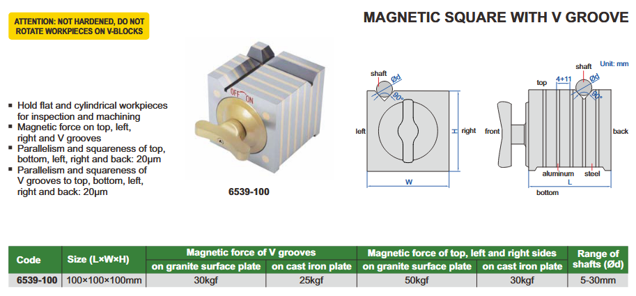 - Magnetna sila V utora: na granitu 30kgf, na ploči od lijevanog željeza: 25kgf