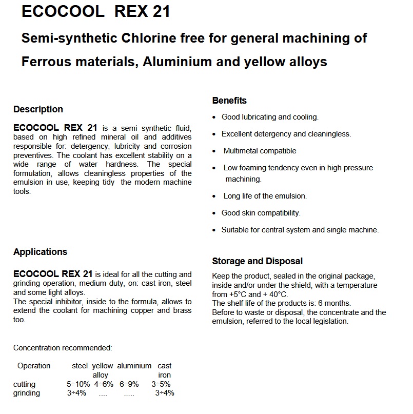 ECOCOOL REX 21 je idealan za sve operacije rezanja i brušenja srednjeg intenziteta na: lijevanom željezu, čeliku i nekim lakim legurama.