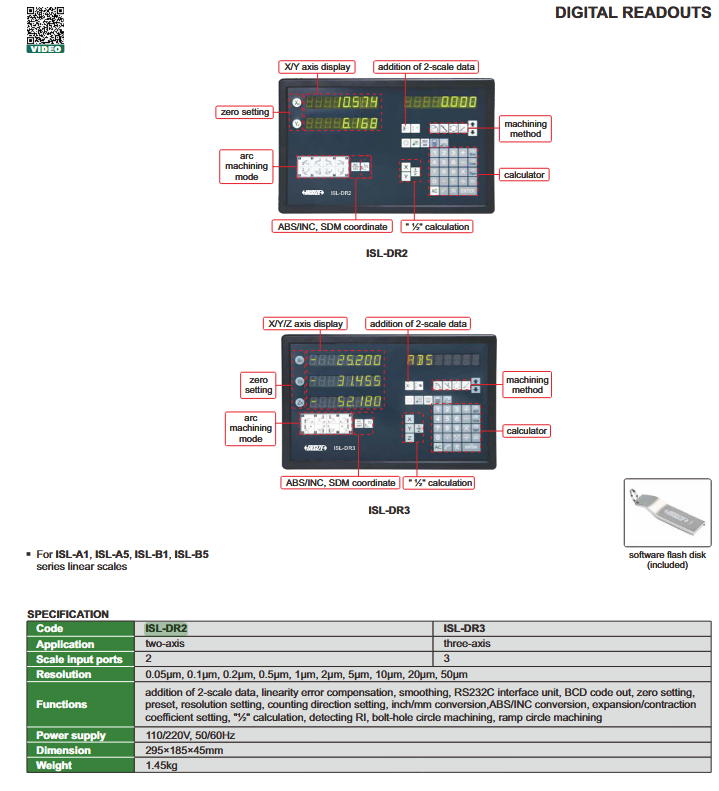- funkcije: Addition of 2-Scale data, linearity error compensation, smoothing, RS232C interface unit, BCD code out, zero setting, pre-set, resolution setting, counting direction setting, inch/mm conversion, ABS/INC conversion, expansion/contraction coefficient setting, ½ calculation, detecting RI, bolt-hole circle machining, ramp circle machining